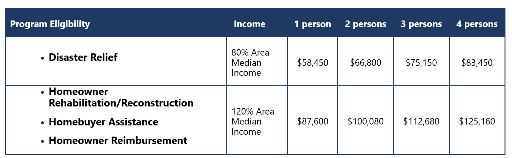 Homebuyer Assistance: Help for income-eligible homebuyers to purchase a safe home outside flood zones.