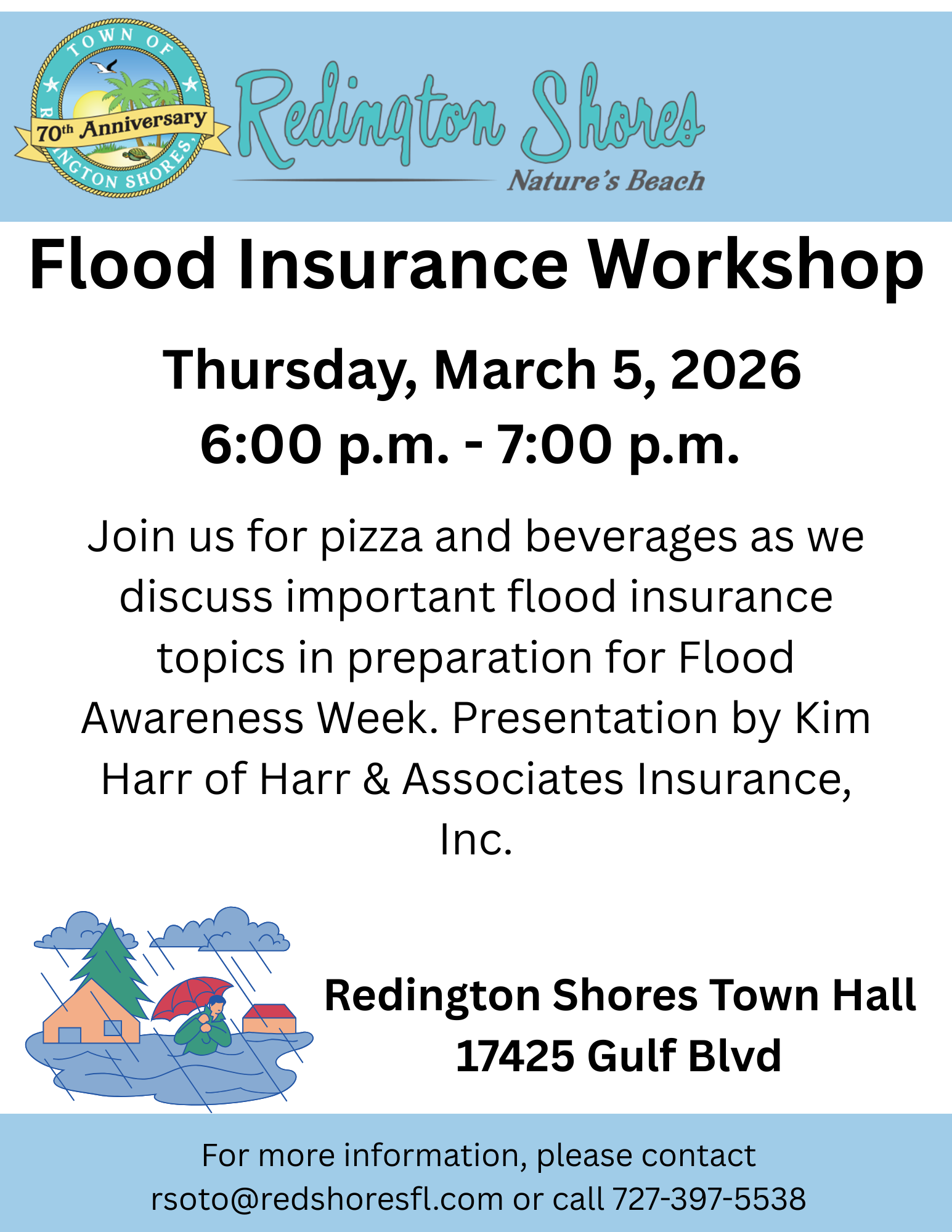 Join us at Town Hall on Thursday, March 5th, 2026 from 6 p.m. to 7 p.m. for pizza and beverages as we discuss important flood insurance topics in preparation for Flood Awareness Week. Presentation by Kim Harr of Harr & Associates Insurance, Inc.