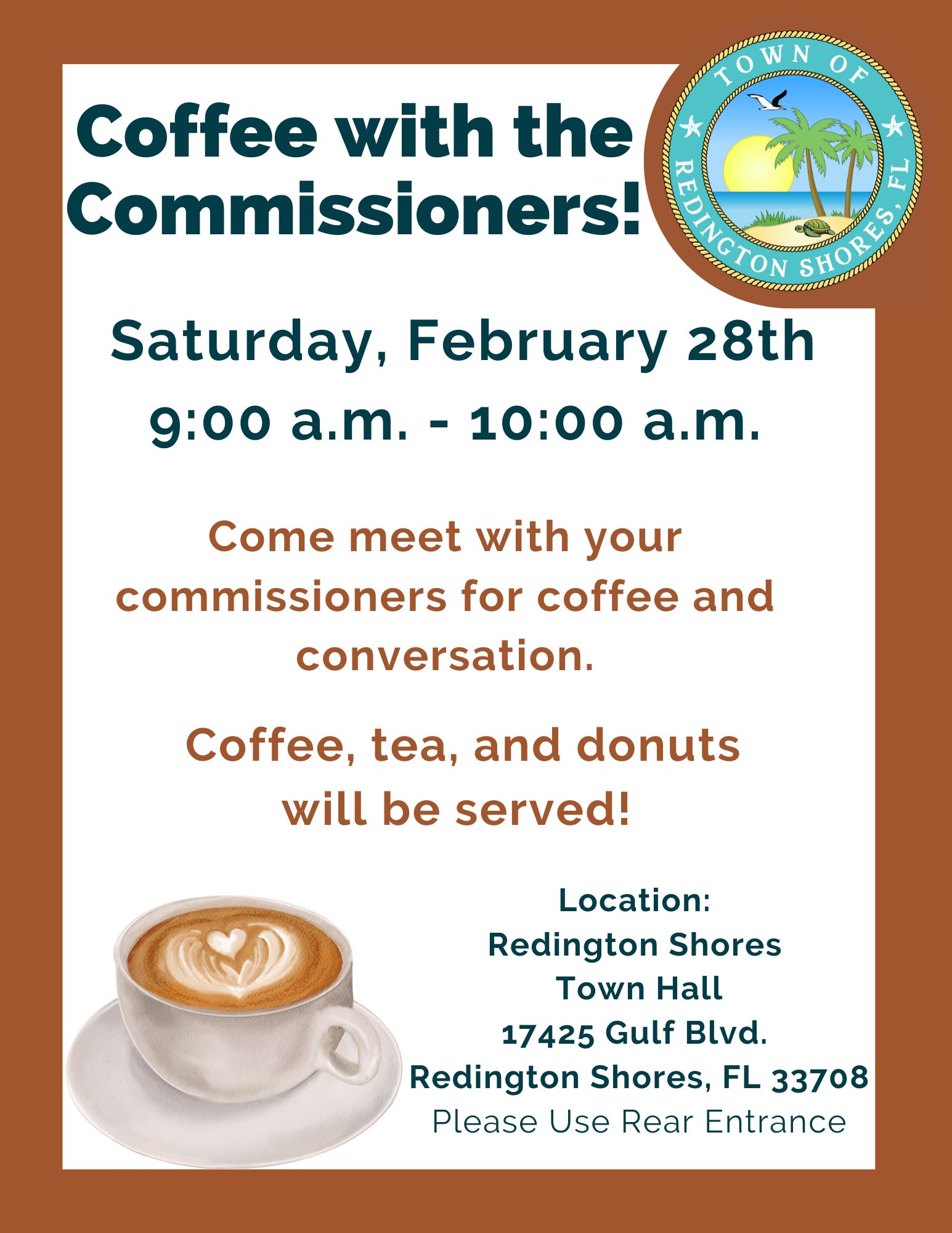 Join us for Coffee with the Commissioners 2/28/26February 4, 2026events, town hall0 Join us for Coffee with the Commissioners – Saturday, February 28, 9-10am. Town Hall. Please use rear entrance. Come meet with your commissioners for coffee and conversation. Coffee, tea, and donuts will be served! Click to view larger Share this post Previous